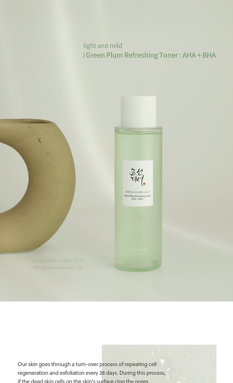 The skin repeats the turn-over process of exfoliating dead cells and generating new skin cells every 28 days, and inflammation can occur in the pores, and new cell formation can be avoided if dead skin cells on the surface of the skin block pores, resulting in darker skin tone; so we created Green Plum AHA+BHA Toner, which is a light and mild toner that can wipe away dead skin cells and sebum from the skin surface and pores that remain after cleansing.