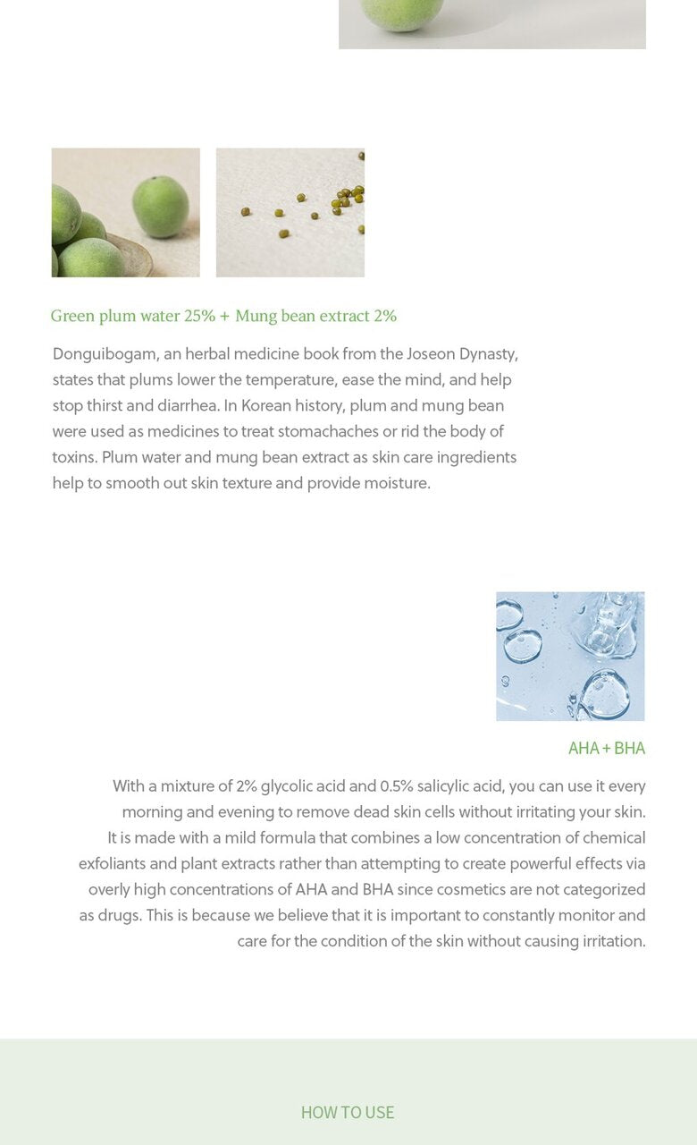 The main ingredient is plum, which has been used as an herbal medicine for a long time, and as a cosmetic ingredient it is a raw material that helps to remove dead skin cells and care for skin texture, and creates synergy with mung bean extract, a skin soothing ingredient, and chemical exfoliating ingredients AHA and BHA.