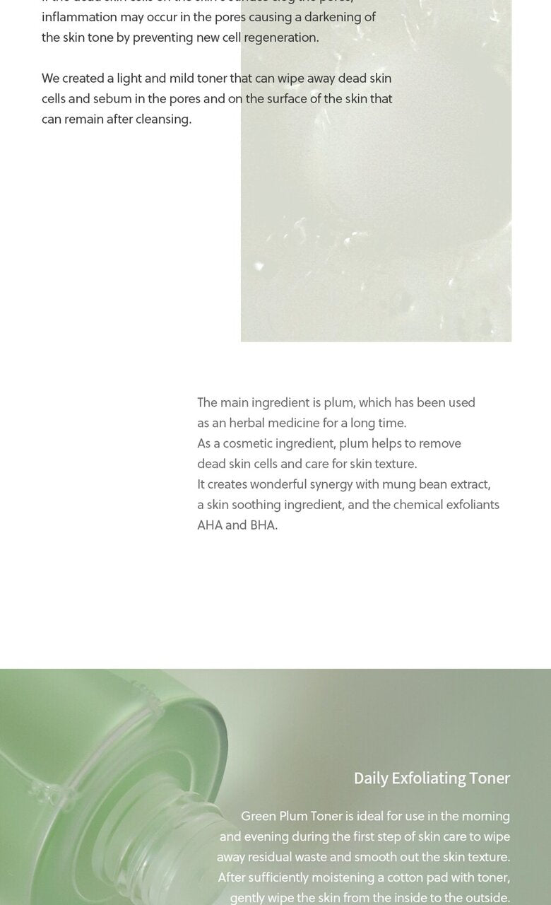 The skin repeats the turn-over process of exfoliating dead cells and generating new skin cells every 28 days, and inflammation can occur in the pores, and new cell formation can be avoided if dead skin cells on the surface of the skin block pores, resulting in darker skin tone; so we created Green Plum AHA+BHA Toner, which is a light and mild toner that can wipe away dead skin cells and sebum from the skin surface and pores that remain after cleansing.