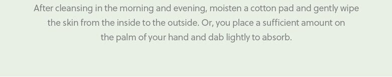 After washing your face in the morning and evening, soak a cotton pad and gently wipe it from the center of the face to the outside of the skin, or take a small amount on the palm of your hand and lightly pat the skin to absorb.