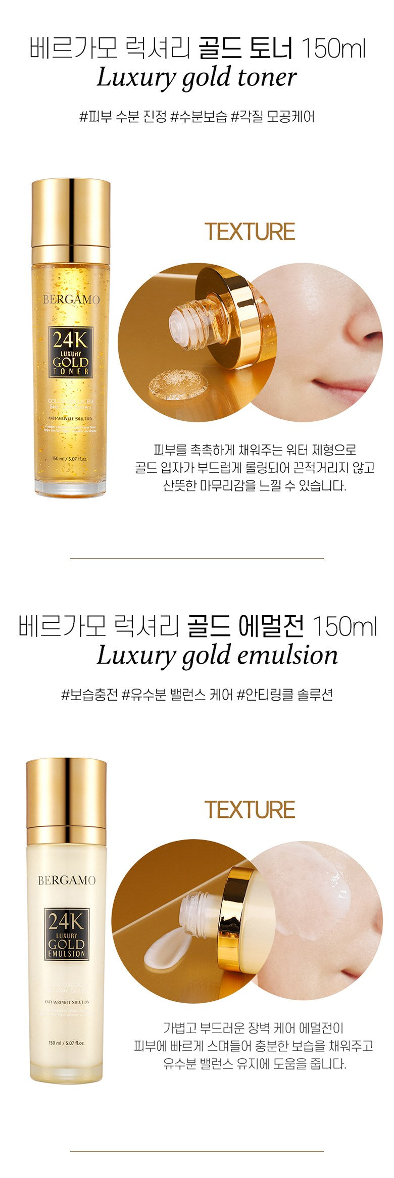- Luxury Gold Emulsion (150ml): Balances oil and moisture for a hydrated, wrinkle-free complexion.