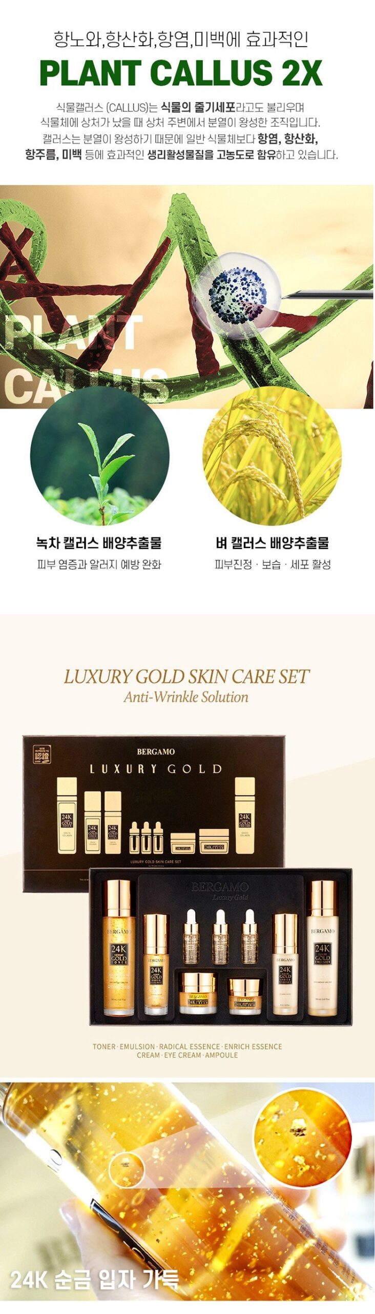 - Luxury Gold Radical Essence & Enrich Essence (50ml each): Enhances skin texture and tightness, allowing for a luminous and elastic finish.