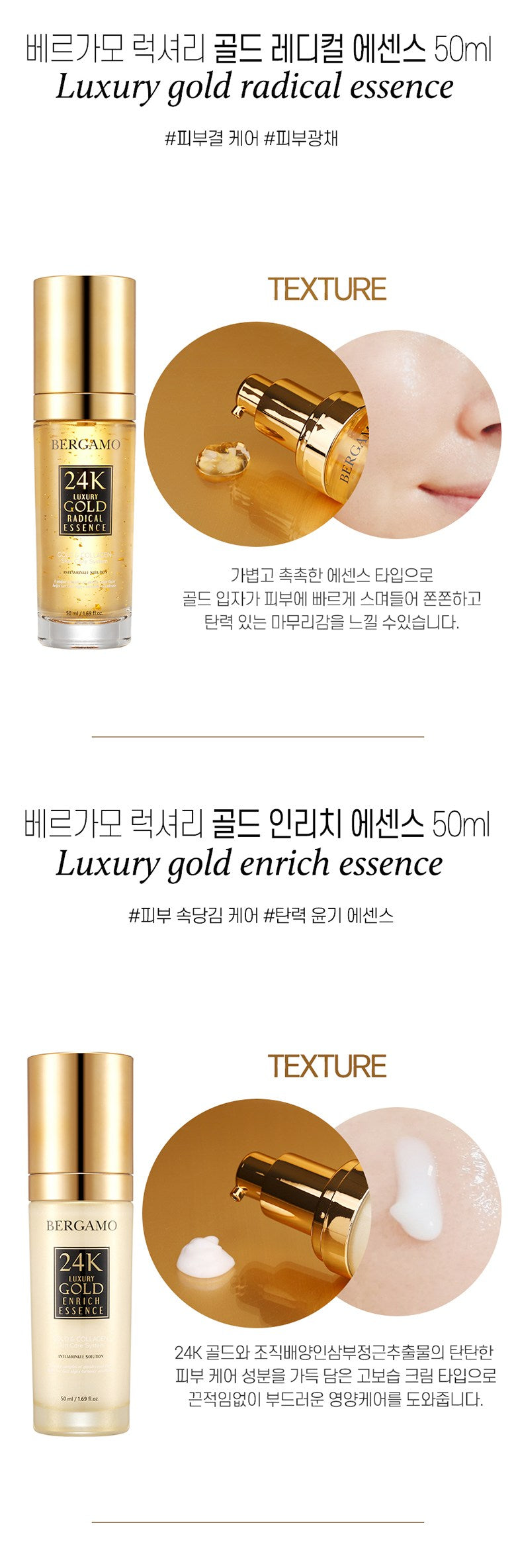- Luxury Gold Radical Essence & Enrich Essence (50ml each): Enhances skin texture and tightness, allowing for a luminous and elastic finish.