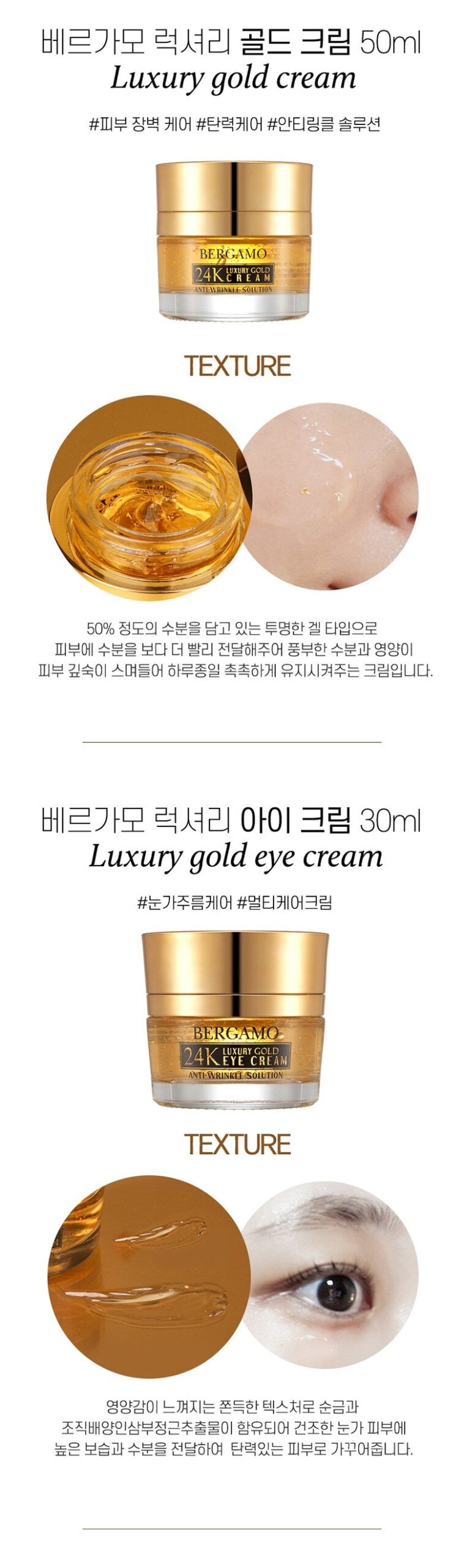 - Luxury Gold Cream (50ml): A gel-type cream that deeply hydrates, focusing on barrier and elasticity care.