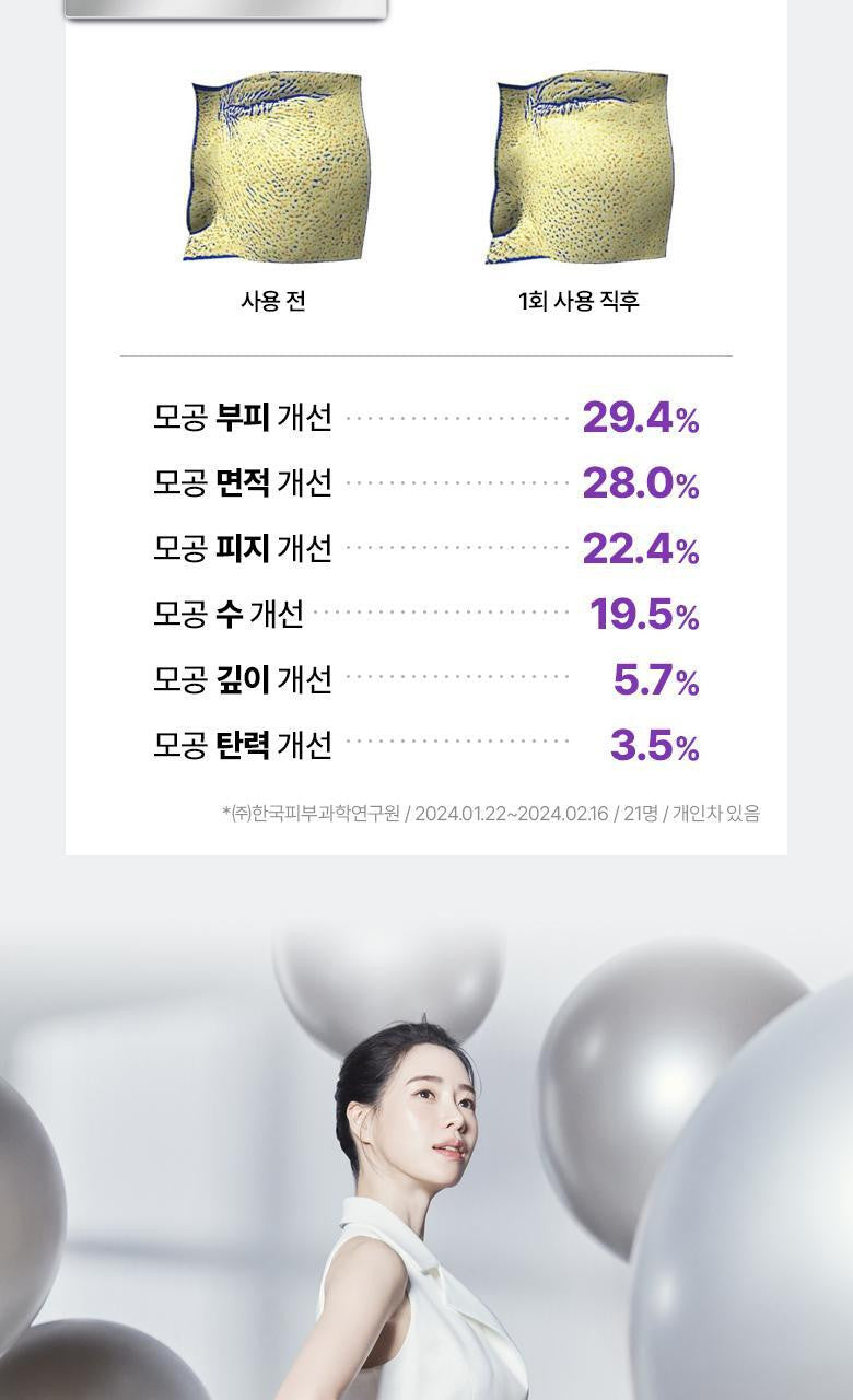 Bid farewell to saggy pores compromised by sun exposure with our serum that promises immediate improvement. Addressing six major pore concerns—volume, area, sebum, number, depth, and elasticity—our formula is your ally in achieving visibly refined and resilient skin.