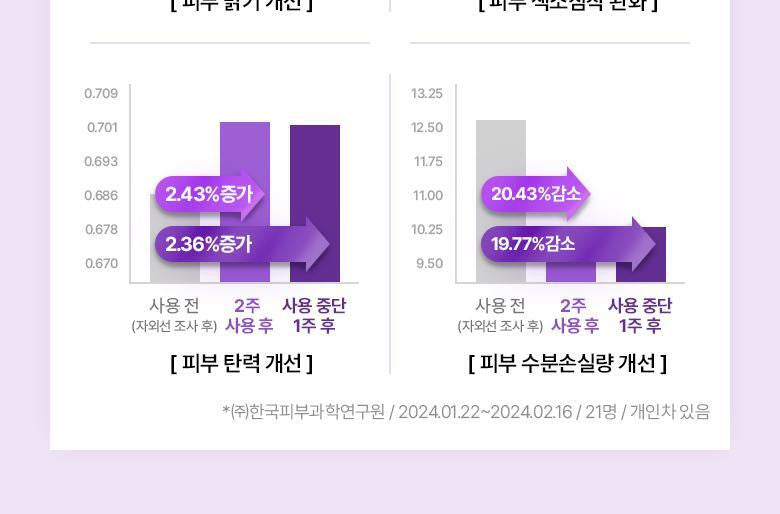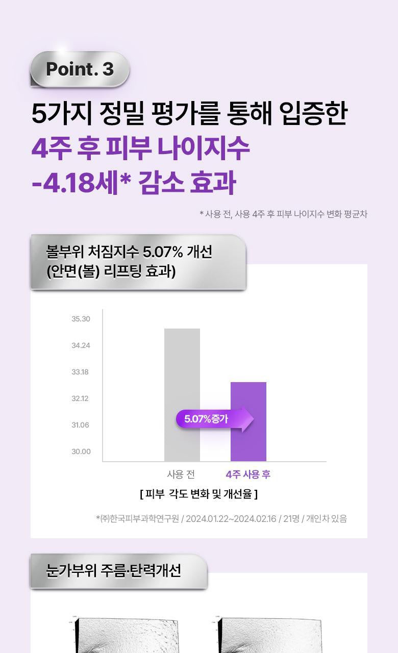 After just four weeks of regular use, witness a remarkable decrease in the skin age index by -4.18 years, along with an uplifted cheek area, and enhanced wrinkle reduction and elasticity around the eyes. Our serum not only improves skin density and moisture but also offers an unparalleled lifting effect.