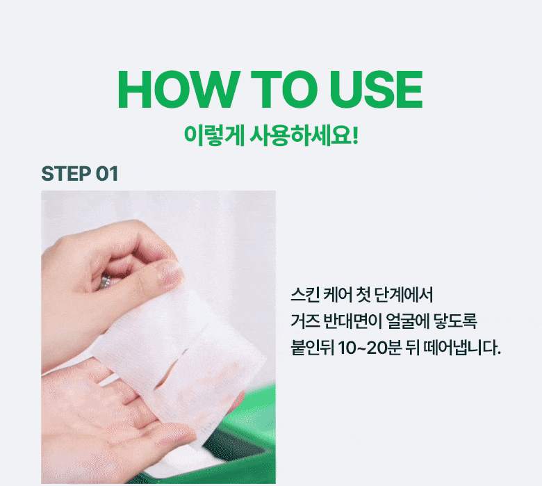 - At the beginning of your skincare routine, apply the gauze pad with the softer side against your face. Leave it on for 10 to 20 minutes.