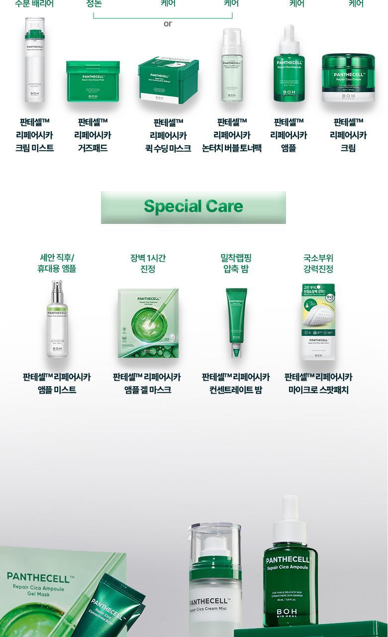 - PANTHECELL™ REPAIR CICA: Combines 12 types of protein ingredients for skin repair, CGF for skin soothing, and a high concentration (75.5%) of Centella Asiatica extract, along with Panthenol and a 5% wall reinforcement component.