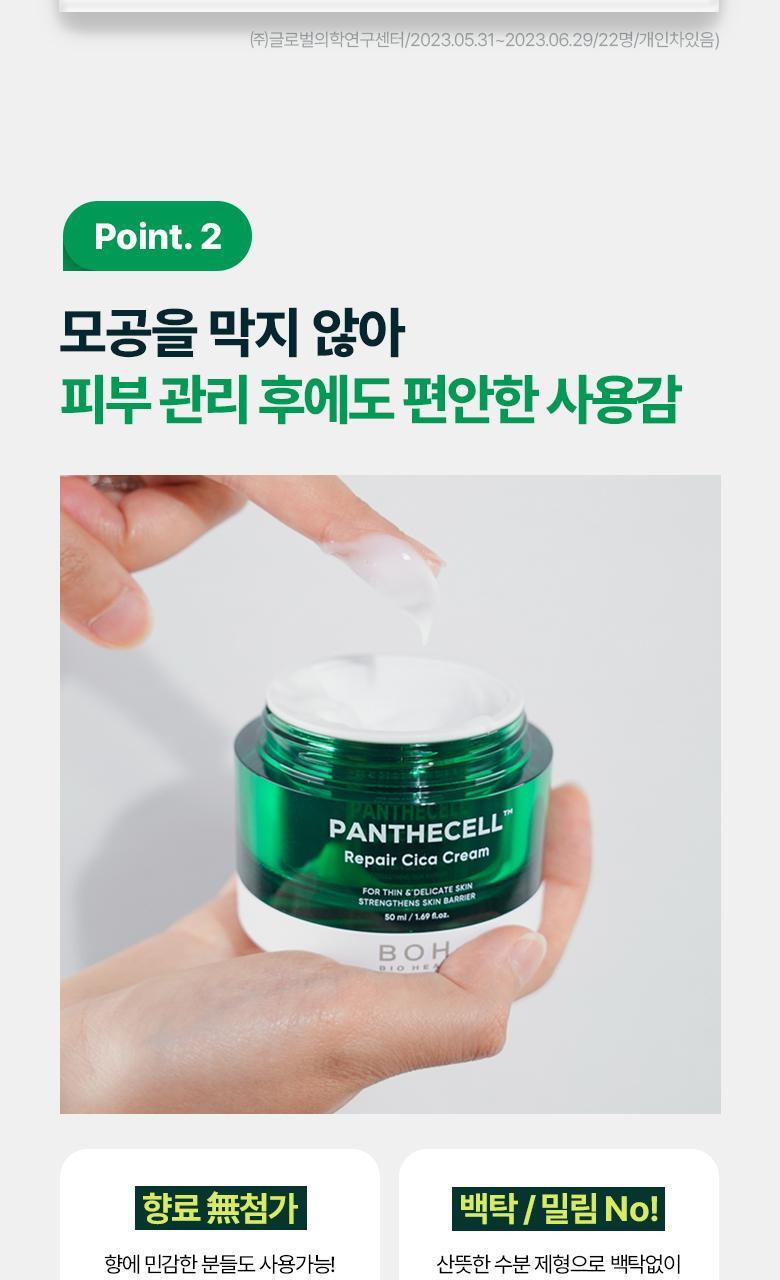 - PANTHECELL™ REPAIR CICA: Combines 12 types of protein ingredients for skin repair, CGF for skin soothing, and a high concentration (75.5%) of Centella Asiatica extract, along with Panthenol and a 5% wall reinforcement component.