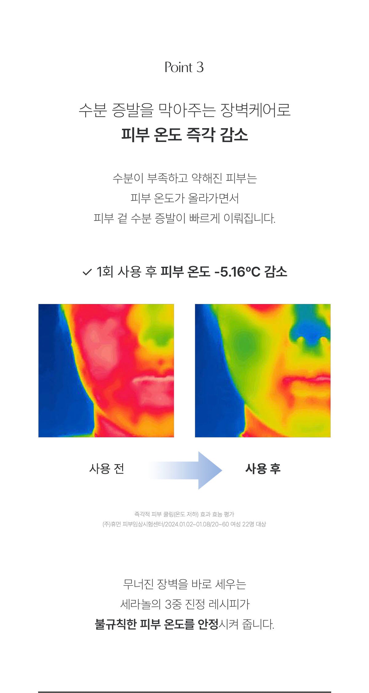 - Temperature Regulation: Combat the effects of dehydration and weakened skin barriers with a notable decrease in skin temperature by -5.16 degrees upon application. The Cera-nol’s triple soothing recipe helps stabilize skin temperature, reinforcing the skin’s natural barrier against external stressors.