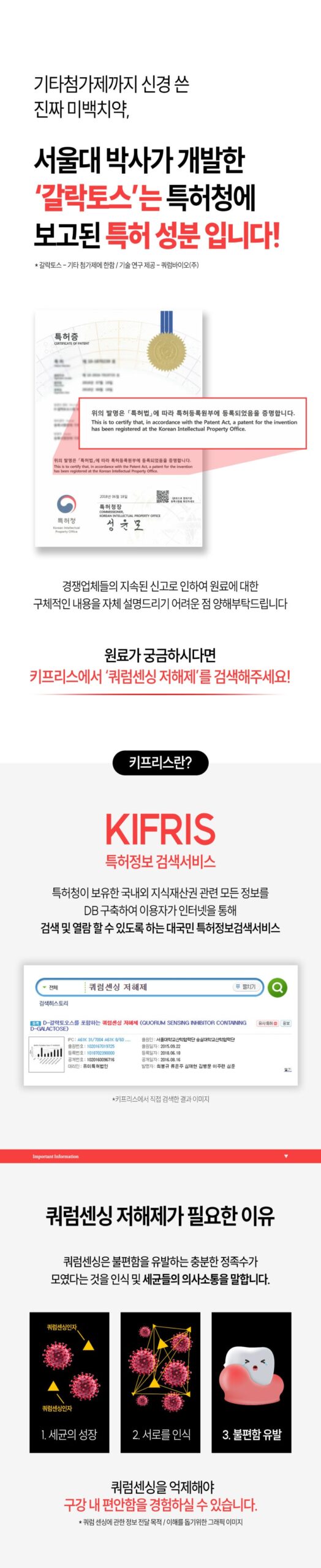 Developed in collaboration with a doctor from Seoul National University, our toothpaste contains a blend of advanced ingredients known for their dental benefits. It features a patented ingredient, Galactose, innovated by Quorum Bio Co., Ltd., and endorsed by the Korean Intellectual Property Office for its effectiveness in quorum sensing inhibition. This technology targets the communication pathways of bacteria, ensuring a comprehensive approach to oral health.