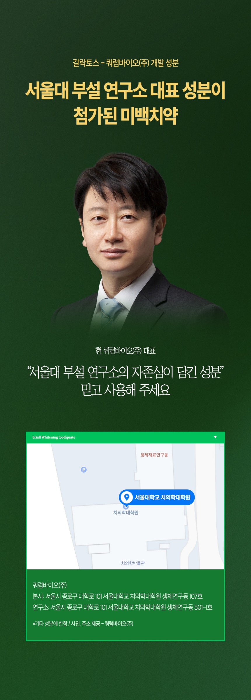 Developed in collaboration with a doctor from Seoul National University, our toothpaste contains a blend of advanced ingredients known for their dental benefits. It features a patented ingredient, Galactose, innovated by Quorum Bio Co., Ltd., and endorsed by the Korean Intellectual Property Office for its effectiveness in quorum sensing inhibition. This technology targets the communication pathways of bacteria, ensuring a comprehensive approach to oral health.