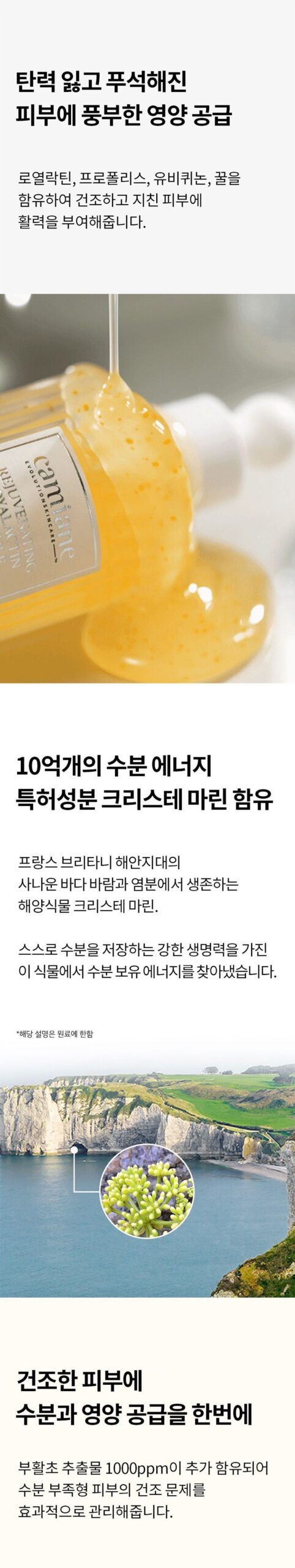 Contains royal lactin, propolis, ubiquinone, and honey to revitalize dry and tired skin.