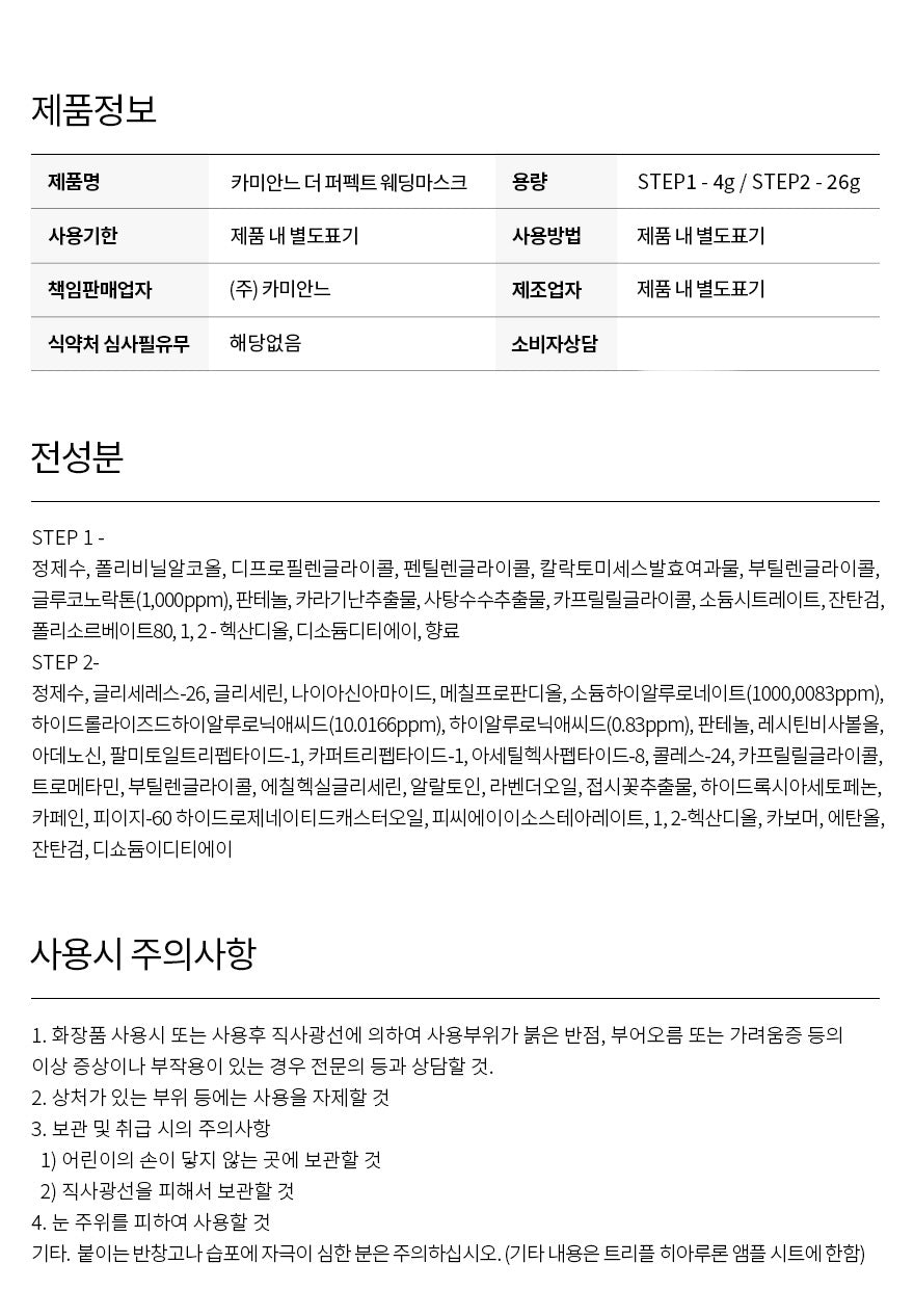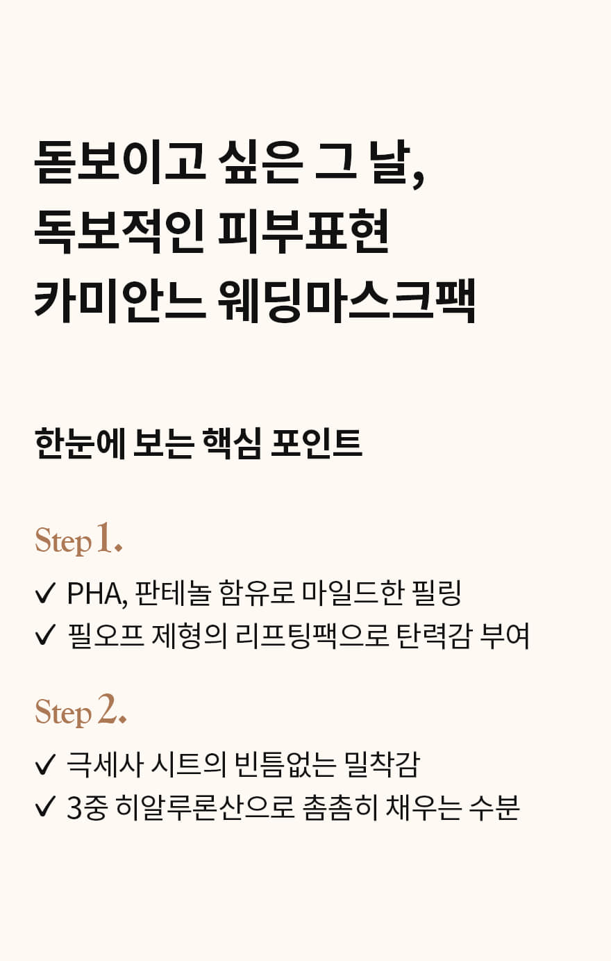 I recently tried the Camiane The Perfect Wedding Mask, and I was thoroughly impressed. The two-step process is well thought out; the Step 1 peeling lift pack contains PHA and panthenol that effectively exfoliates dead skin cells while providing a lifting effect. After using it, my skin felt smoother and firmer right away. Then comes the sheet mask infused with triple hyaluronic acid in Step 2, which delivered intense hydration without feeling heavy or greasy. My complexion looked radiant after just one use! This has truly become an essential part of my skincare routine before any special occasion.