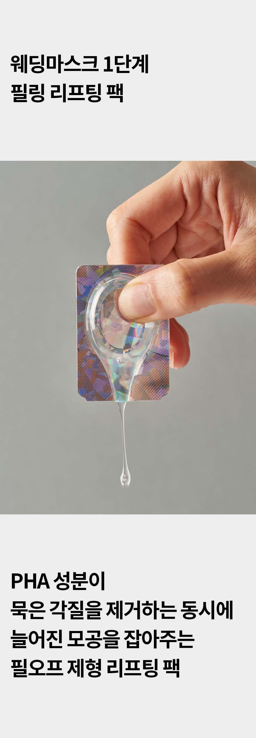 Peel-off lifting pack containing PHA ingredient that peels off dead skin cells and tightens the face at the same time.