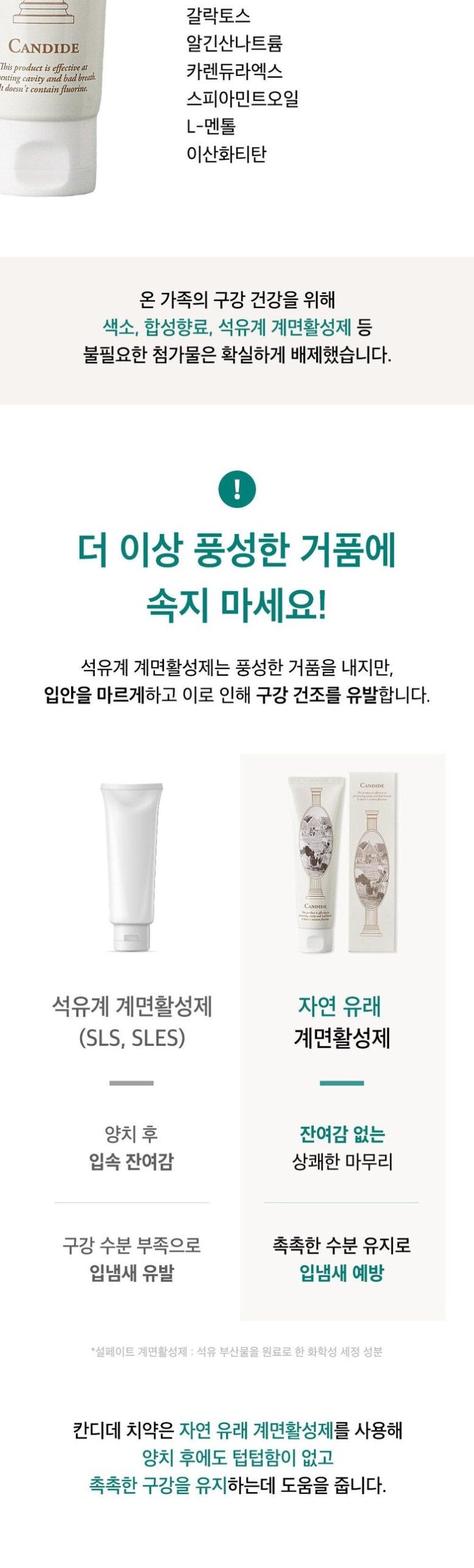 Candide toothpaste uses naturally derived surfactants to help maintain a moist oral cavity without leaving a greasy feeling even after brushing.