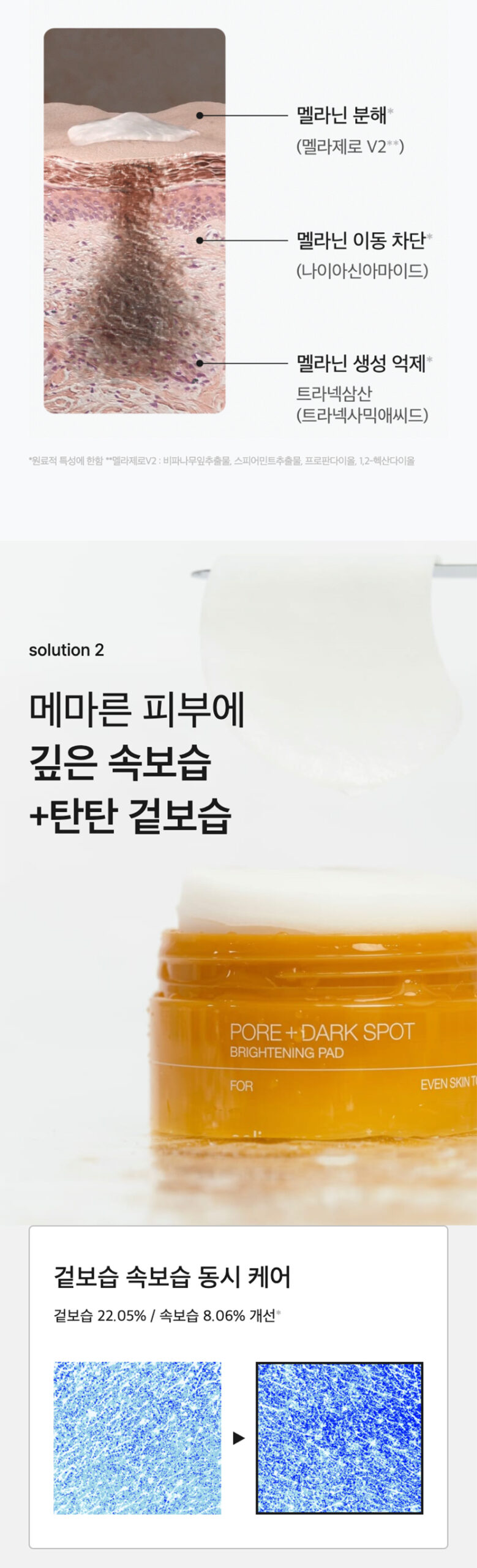 Brightening & Spot‑Correcting: Intensive triple melanin care—tranexamic acid (melanin inhibitor), niacinamide (blocks melanin transfer), and Melazero V2 (breaks down existing melanin).