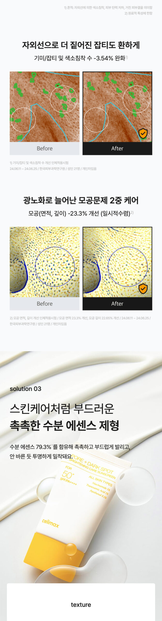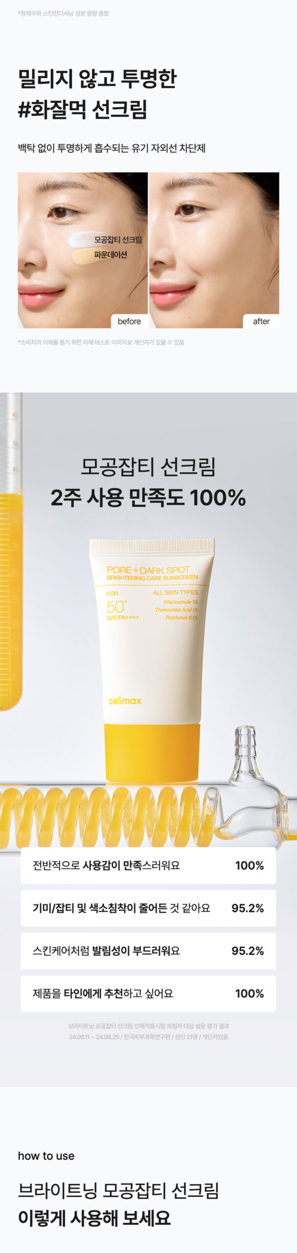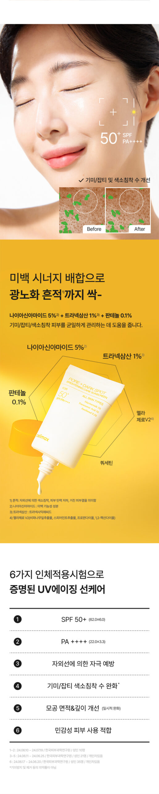 This multifunctional sun cream provides powerful UV defense while visibly improving skin tone, pigmentation, and pores caused by photoaging. Formulated with a skin-loving blend of niacinamide, special nexamic acid, and panthenol, it targets freckles, dark spots, and rough skin texture—all without irritation.