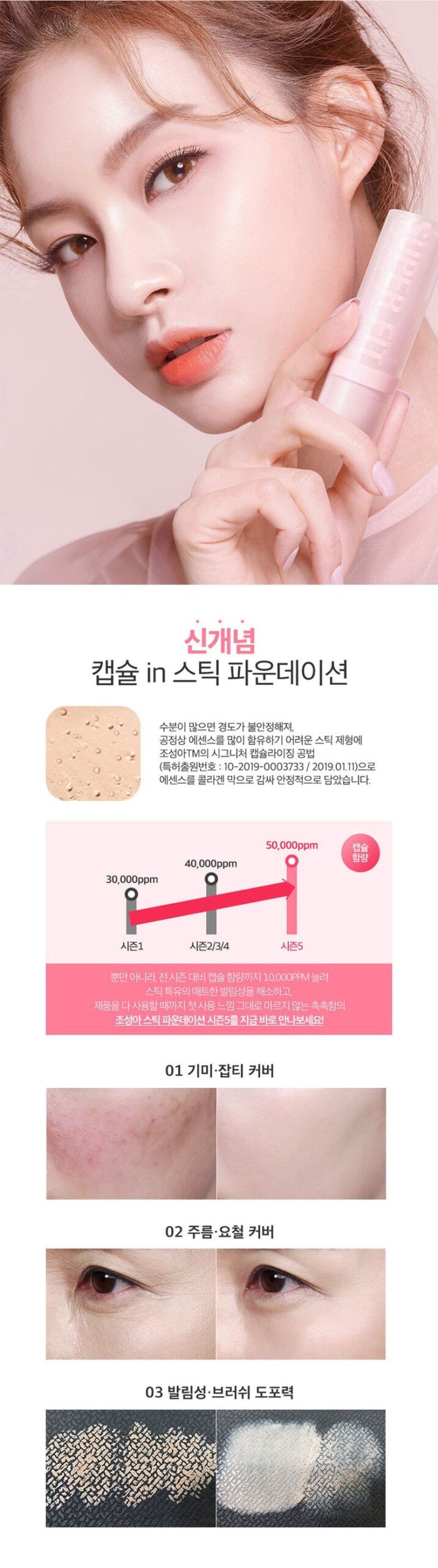 Introducing a new concept capsule-in-stick foundation. The patented encapsulating method (patent 10-2019-0003733) ensures the essence is wrapped in a collagen membrane for stable storage.