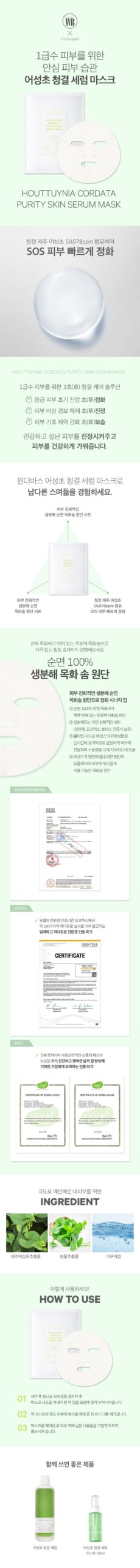 The Houttuynia Cordata Purity Skin Serum Mask is a premium skincare solution, infused with a high concentration of Jeju Houttuynia cordata, designed to purify, calm, and moisturize your skin, especially during SOS situations.