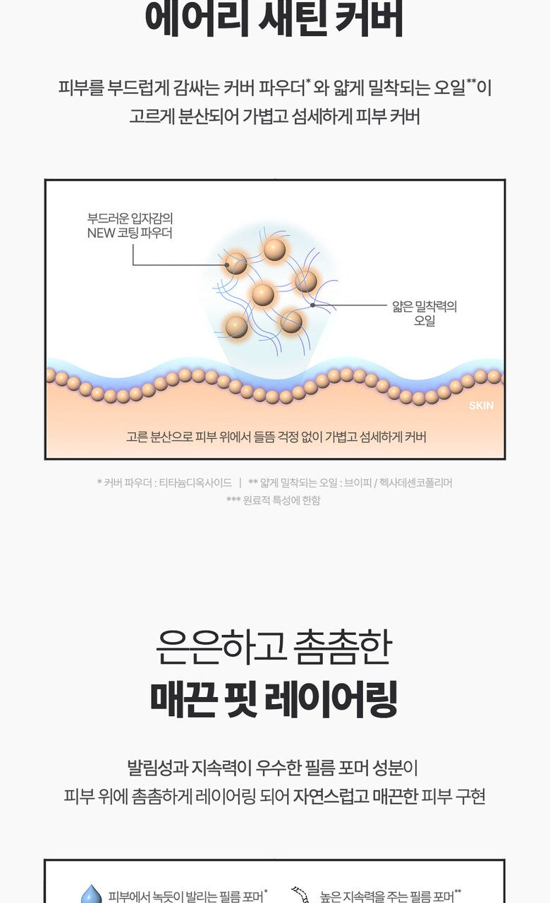 Light and Precise Coverage: The cushion is infused with cover powders that gently envelop the skin, along with lightweight oils that adhere thinly for precise application.
