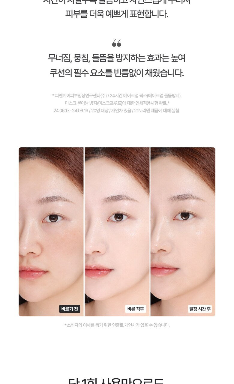 High-Performance Formula: Formulated with ingredients that provide excellent adherence and durability, the cushion layers smoothly on the skin, creating a naturally radiant finish without darkening or dullness throughout the day.