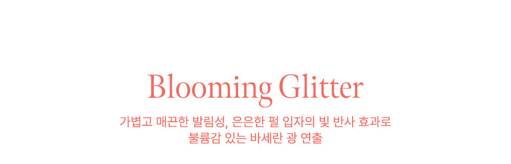 - Blooming Glitter – Ultra-light texture with fine pearl particles for a soft-focus effect and a subtle vaseline-like glow.