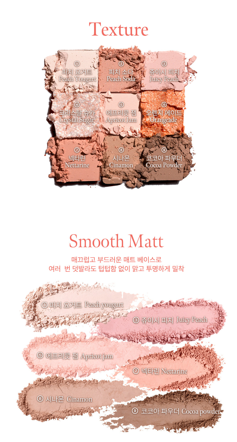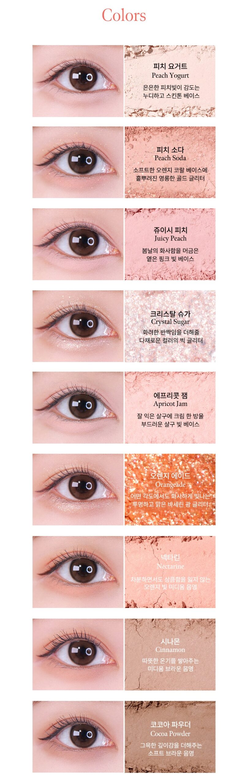 This daily-use shadow palette is designed with a warm-toned selection that brightens up any look. The shades bring out a vibrant and refreshing mood with hues inspired by a juicy flat peach. The palette includes perfectly curated tones from base to medium, plus shades and glitter options that let you effortlessly create a look as unique as your style.