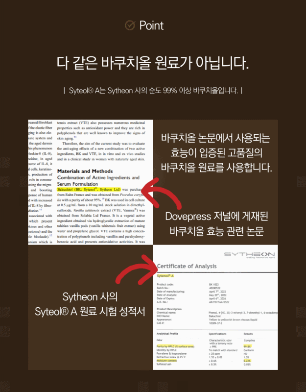 Contains Syteol® A (bakuchiol) from Sytheon, a representative bakuchiol raw material company used in thesis among various raw material companies that make bakuchiol raw materials