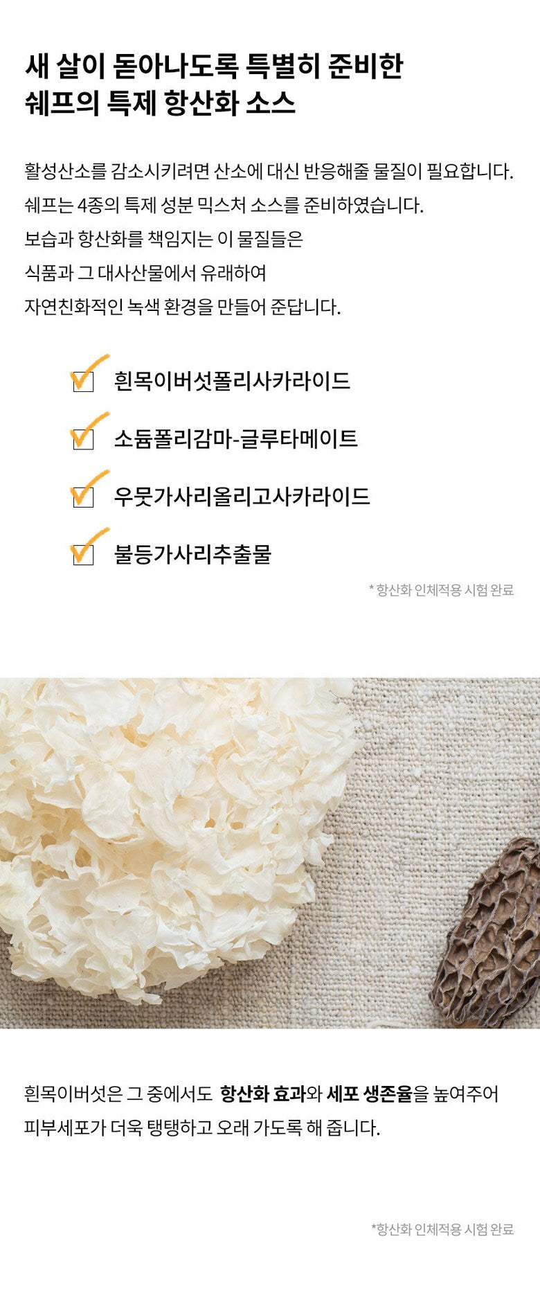 - White Mushroom Polysaccharide: Firms and strengthens skin cells.