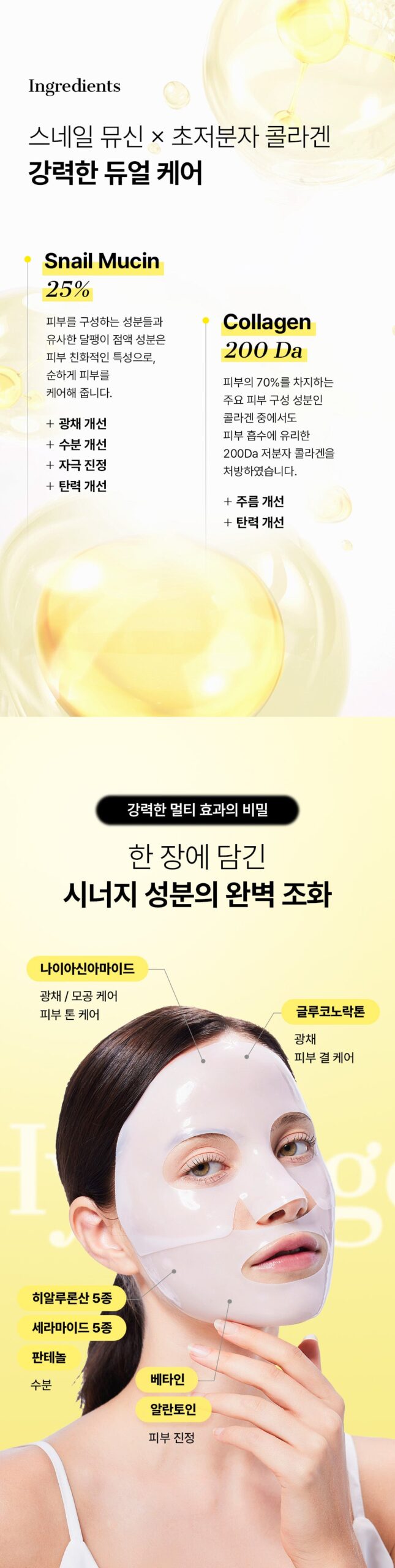 • Snail Mucin (25%): Enriched with 25% snail secretion filtrate, this mask provides gentle care by improving hydration, enhancing radiance, soothing irritation, and boosting skin elasticity.