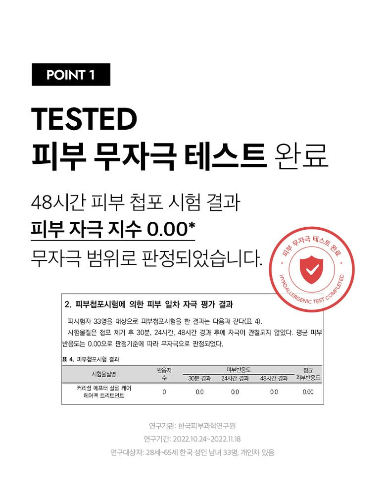 Completed skin irritation test with a 0.00 irritation index, ensuring safe use for all hair types.