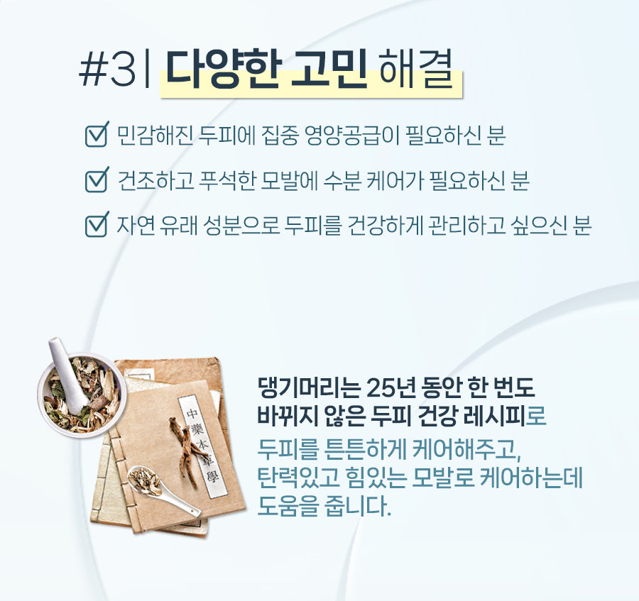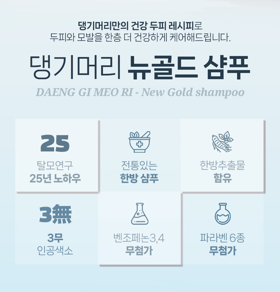 Daenggimeori, renowned for its deep-rooted expertise in hair care, brings you this traditional herbal shampoo. Developed through: