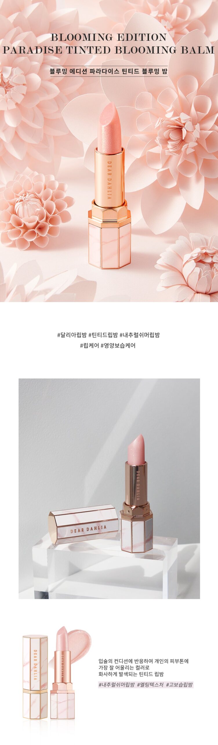 Dear Dahlia Paradise Tinted Blooming Balm is a moisture tinting system that reacts to moisture and develops subtle colors depending on the condition of each individual’s lips, and shimmery pearl particles add volume and shine to the lips.