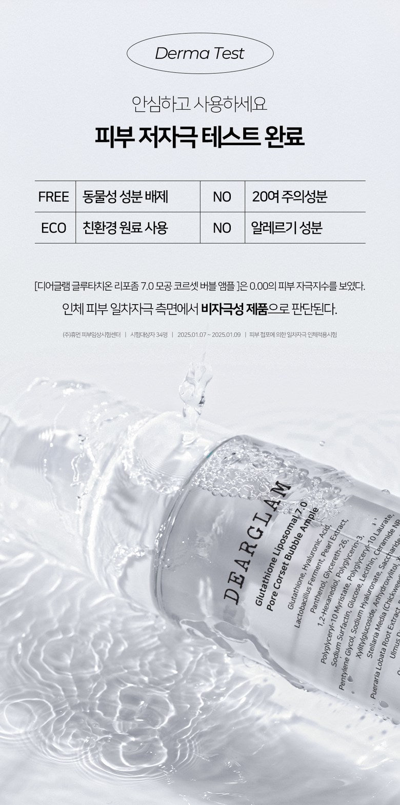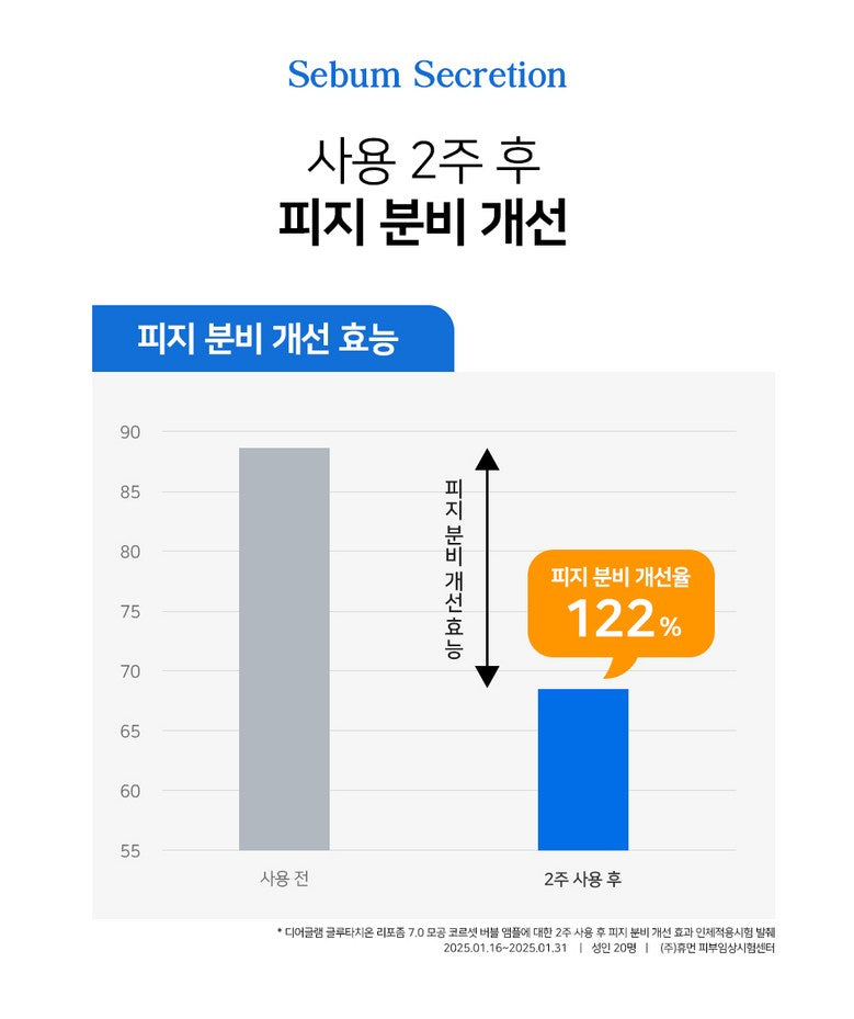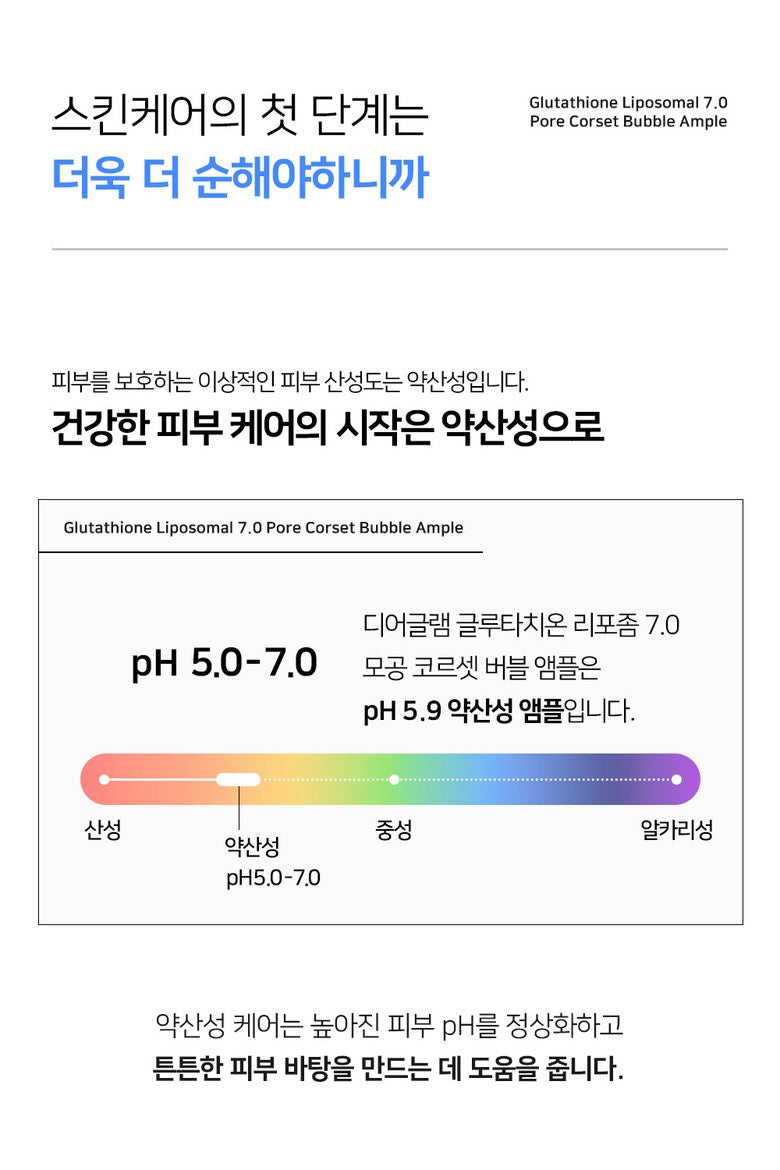 Your skin’s optimal acidic pH level (5.0-7.0) helps maintain a strong skin barrier and prevents moisture loss. The DEARGLAM Glutathione Liposomal 7.0 Pore Corset Bubble Ampoule has a pH of 5.9, ensuring gentle and effective care while restoring the skin’s balance.