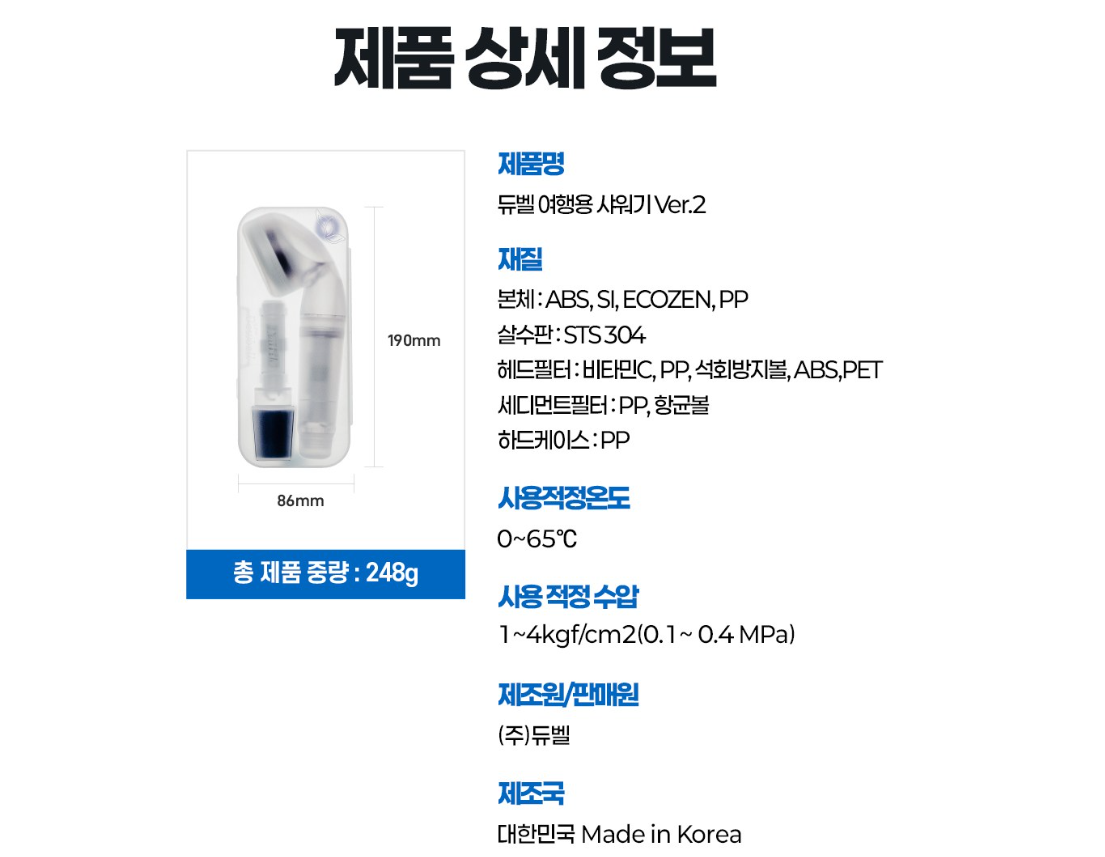Experience the best in water purification with the Dewbell Travel Shower Head, designed for travelers who demand hygienic, high-pressure showers anywhere in the world. Manufactured in Korea with safe and advanced technology, this shower head ensures a fresh and clean shower experience no matter your destination.