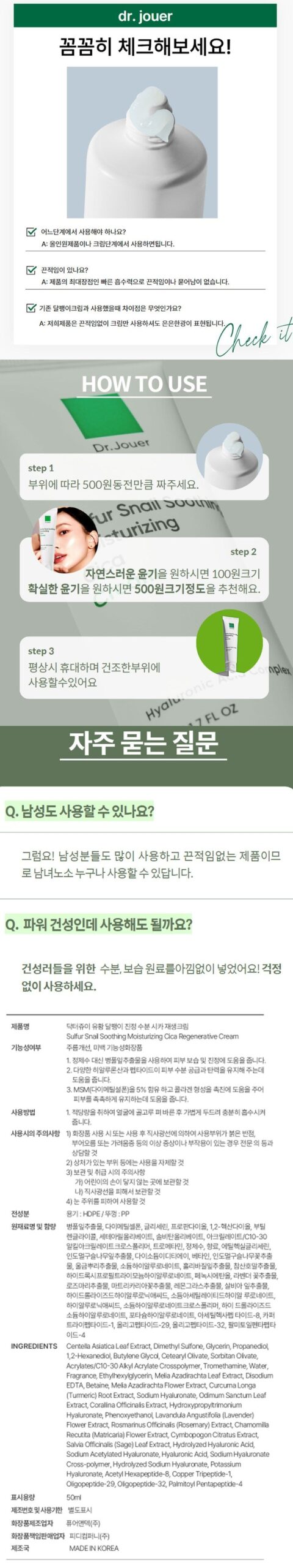 Introducing the Dr. Jouer Sulfur Snail Soothing Moisturizing Cica Cream, a revolutionary skincare solution designed to cater to the needs of sensitive skin while offering substantial improvements in skin texture and appearance. This premium cream has been carefully formulated with a blend of potent ingredients, ensuring noticeable results in just 4 weeks of use.