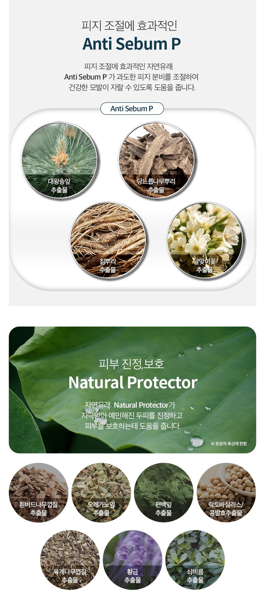 - Anti Sebum P: A natural origin ingredient effective for sebum control. It controls excessive sebum secretion and helps to grow healthy hair. It consists of Daewang pine leaf extract, Sugar Elm Root Extract, Kudzu Root Extract, and evening primrose extract.