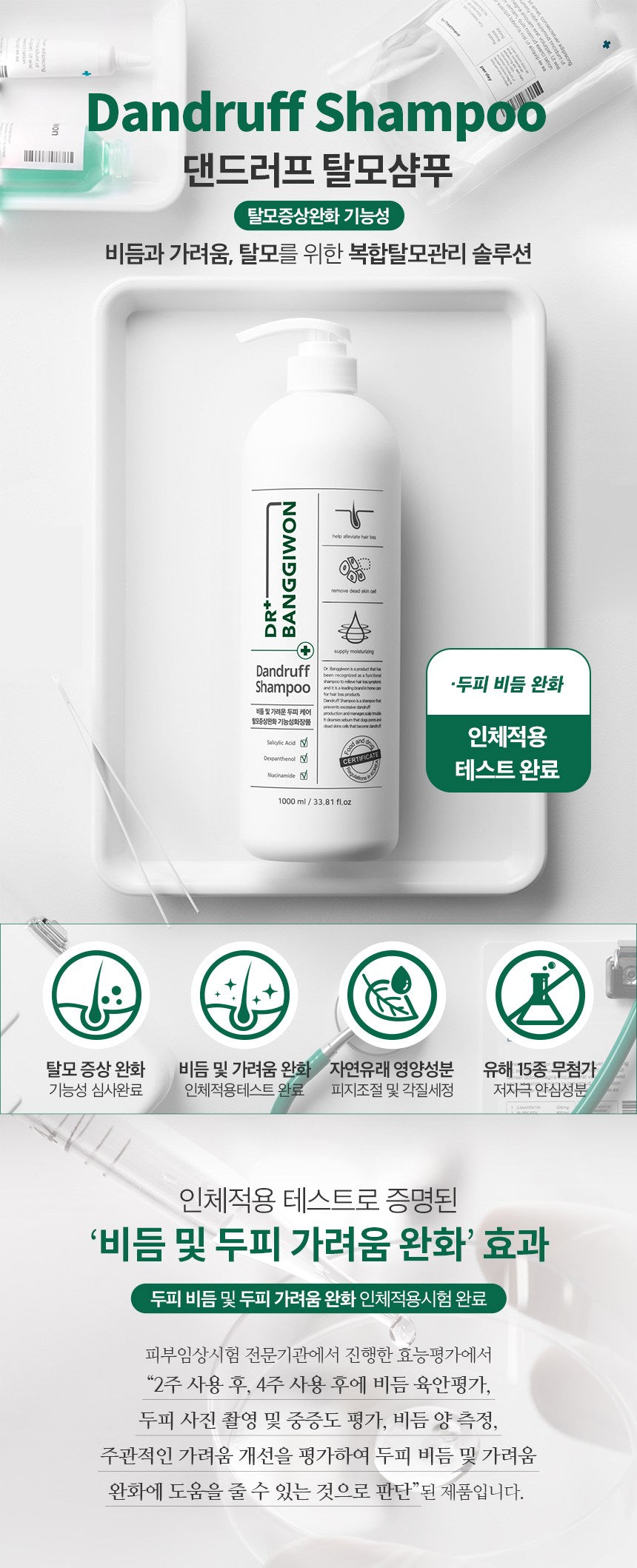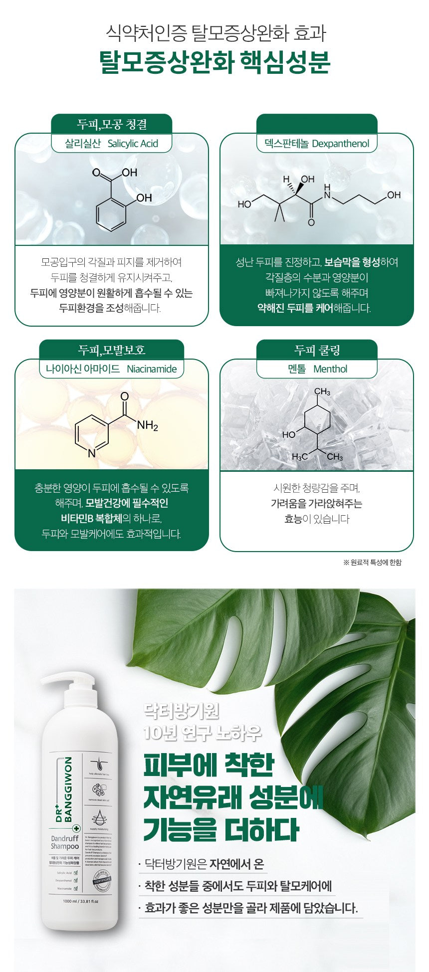 BANGGIWON DR+ Dandruff and Hair Loss Shampoo is a complex hair loss management solution for dandruff, itchiness, and hair loss. The product incorporates Dr. Bang Kiwon’s 10 years of research know-how, with a focus on adding functions to natural ingredients that are kind to the skin.