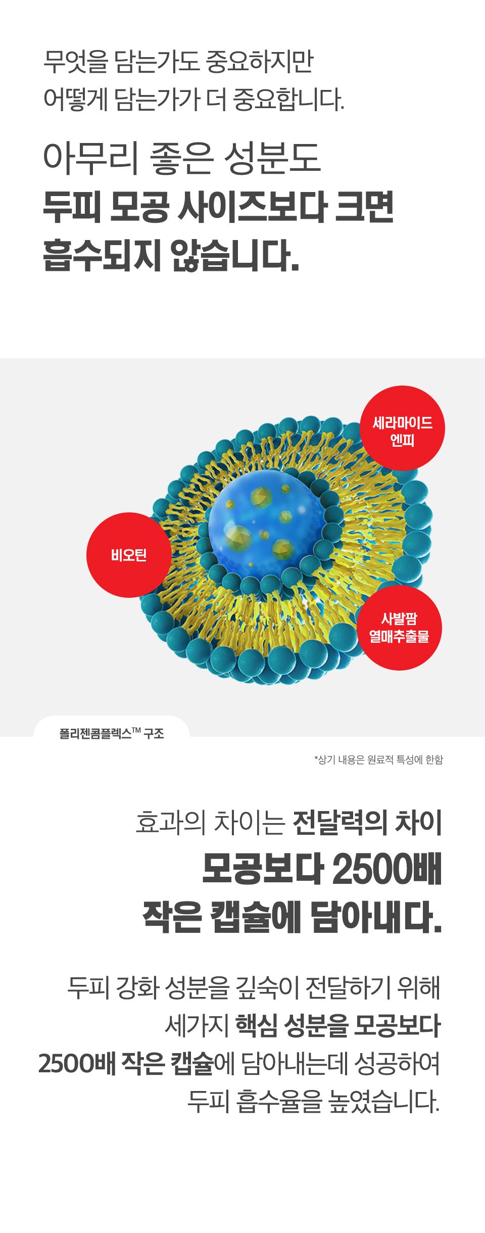 In order to deliver scalp-reinforced ingredients deeply, three key ingredients were successfully put in capsules 2,500 times smaller than pores, increasing scalp absorption.