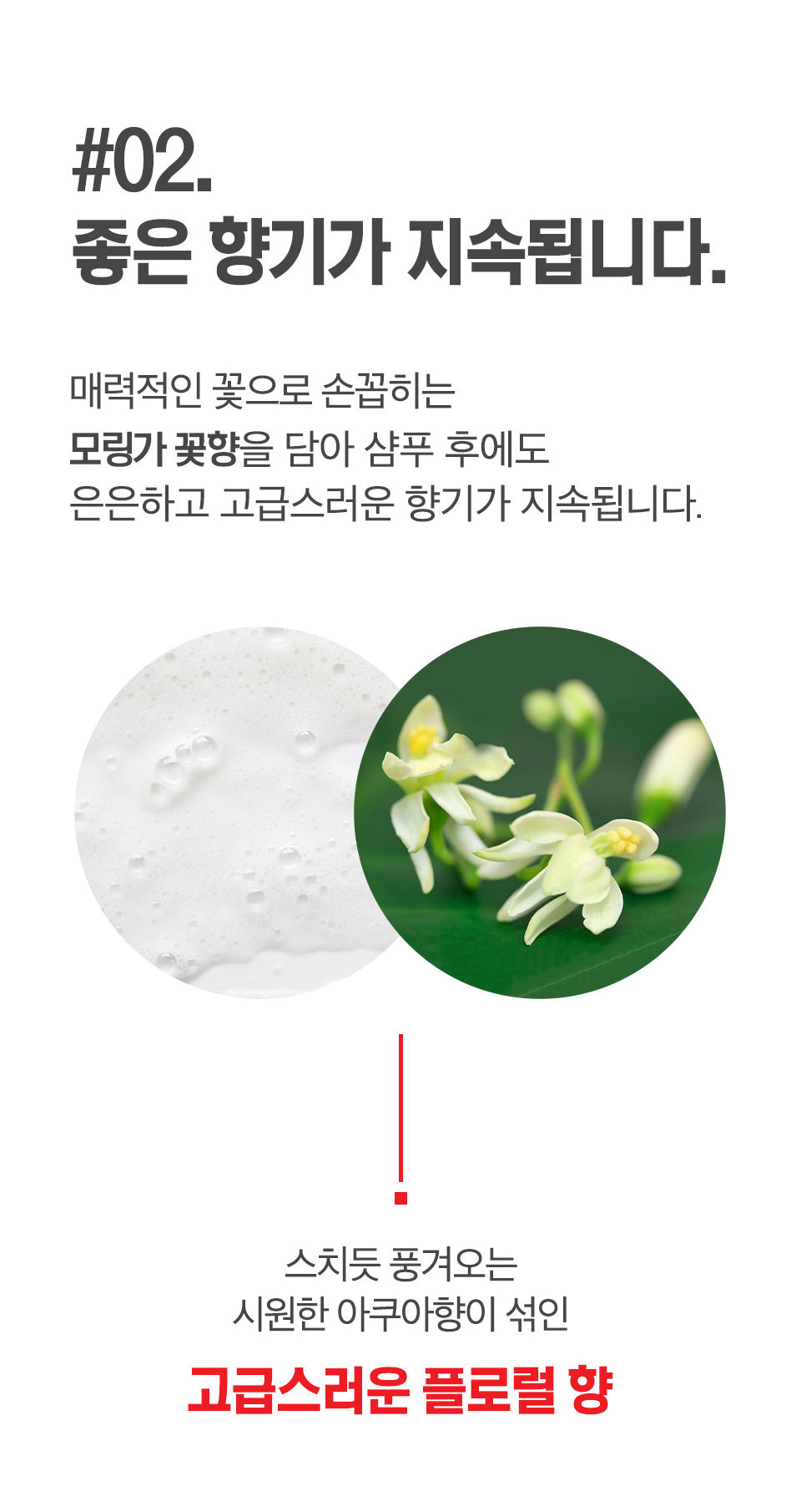 It contains the fragrance of moringa flower, one of the most attractive flowers, so that even after shampooing, the delicate and luxurious fragrance lasts.