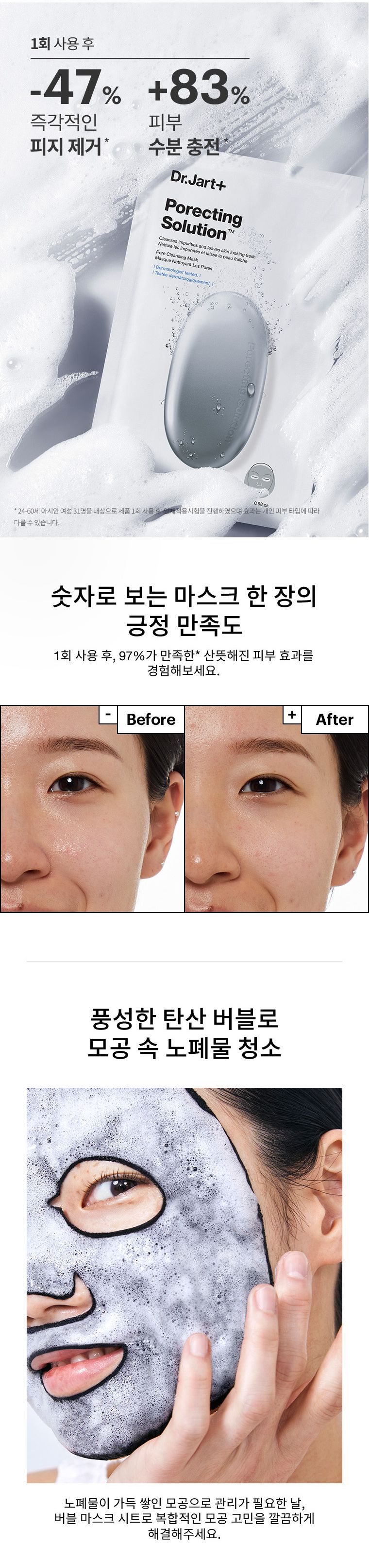 Get fresh, clear, glowing skin with this innovative bubbling mask from Dr.Jart+. The effervescent oxygen bubble effect flushes and eliminates skin impurities as it improves the appearance of enlarged pores. The ultra- thin charcoal sheet wraps skin with a detoxifying and purifying effect. Saponine from the soapberry tree delivers a visible bubbling oxygen action that deeply penetrates pores as Deep Pore Care Complex tightens the look of enlarged pores. A Surface Pore Care Complex helps controls excess oil. 1 sheet