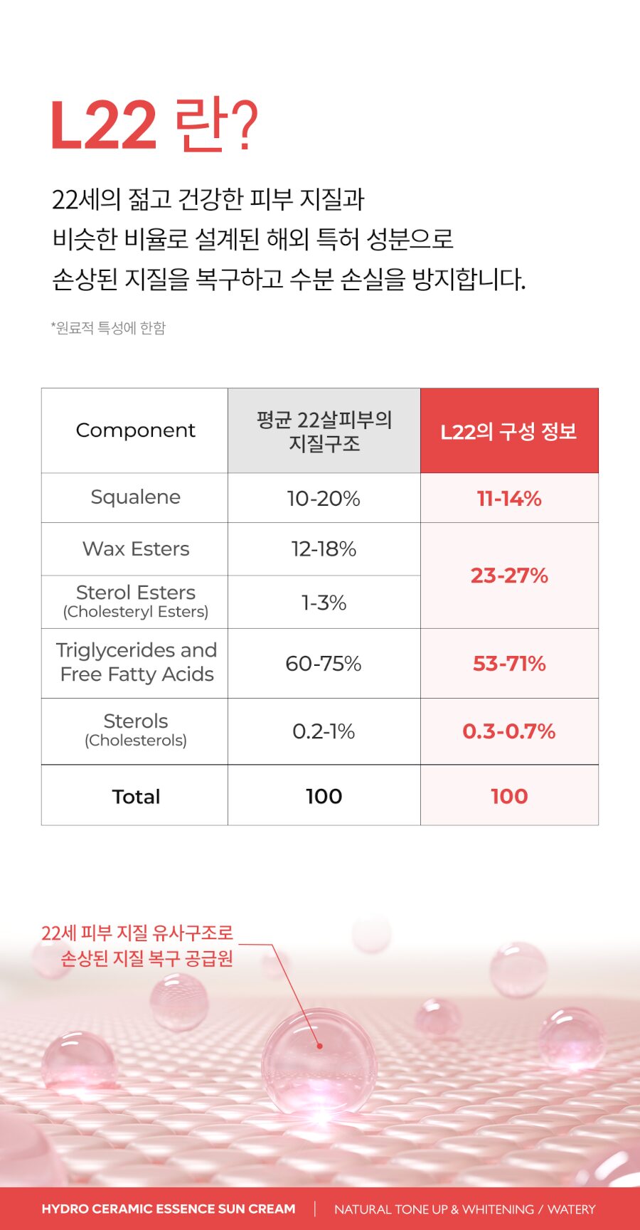 - L22: A patented ingredient inspired by the lipid structure of 22-year-old skin. Repairs damaged lipids, minimizes moisture loss, and supports healthy keratin development.