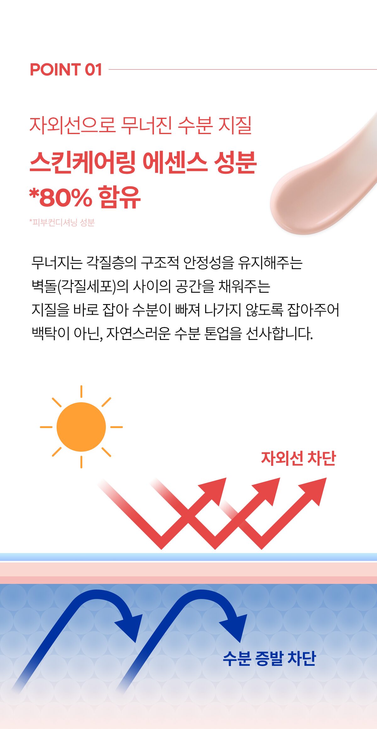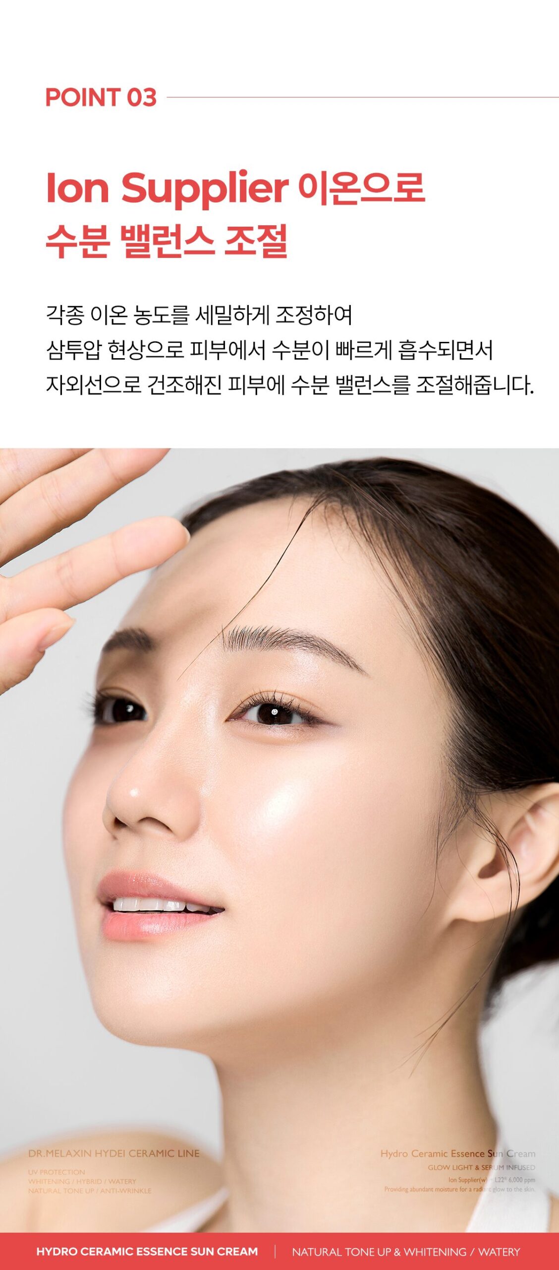 Balances your skin’s moisture with carefully controlled ion concentrations. This allows for rapid absorption and protection against UV-induced dryness.