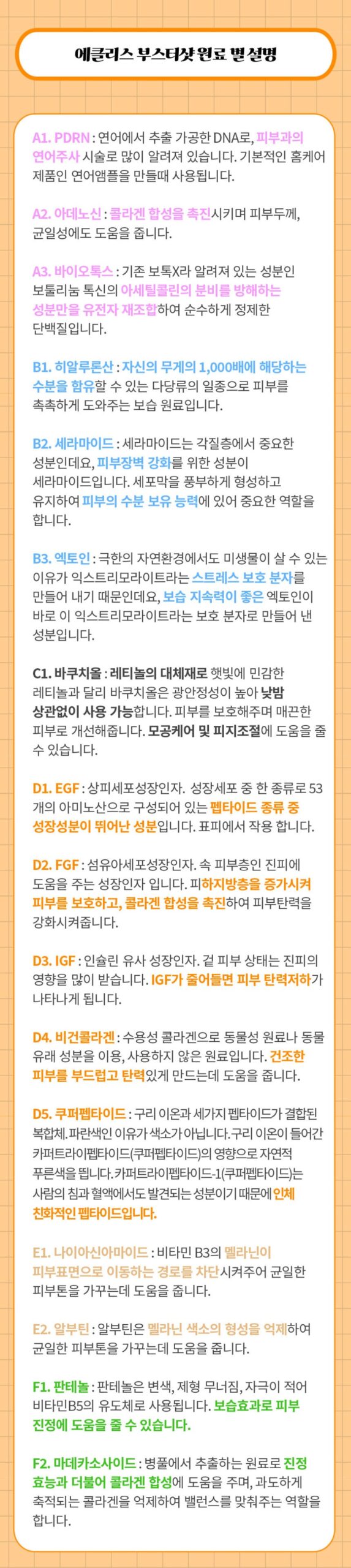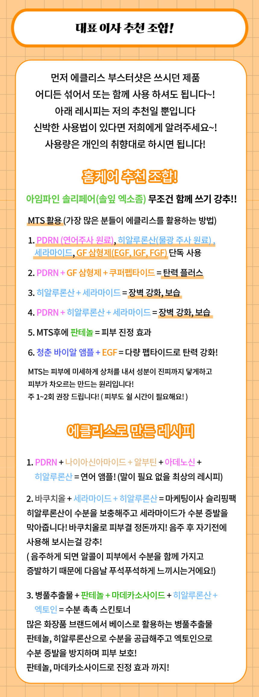 - Elasticity Enhancement: PDRN, EGF, copper peptide.