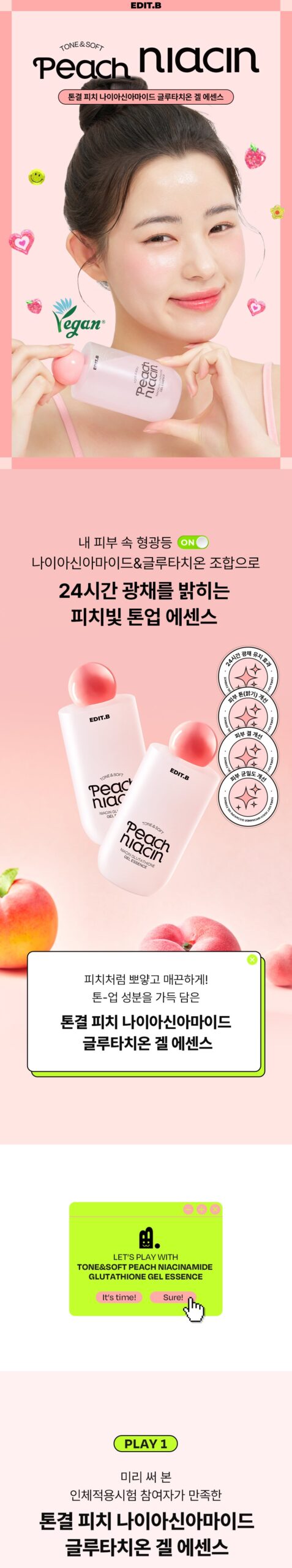 I just started using the EDIT.B Tone & Soft Peach Niacin Glutathione Gel Essence, and I’m pretty chuffed with it! Right off the bat, you can smell that fresh peach scent—just feels like a treat for my skin. I’ve got dull patches on my cheeks from sun exposure over time (ugh!), but after about two weeks of slathering this stuff on daily, I can see some brightening happening! The niacinamide is a great touch; I mean it’s one of those holy grail ingredients in K-beauty that really does deliver results. My makeup glides on so much smoother now too. It’s lightweight without being greasy—total winner in my book! Just what I needed to combat that winter skin vibe here in Manchester!