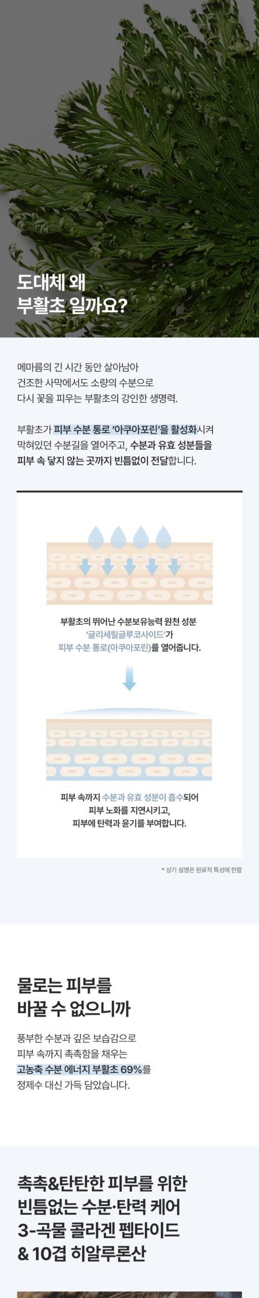 Resurrection plant activates the skin’s moisture channel, aquaporan, to open blocked moisture channels and thoroughly delivers moisture and active ingredients to hard-to-reach areas of the skin.