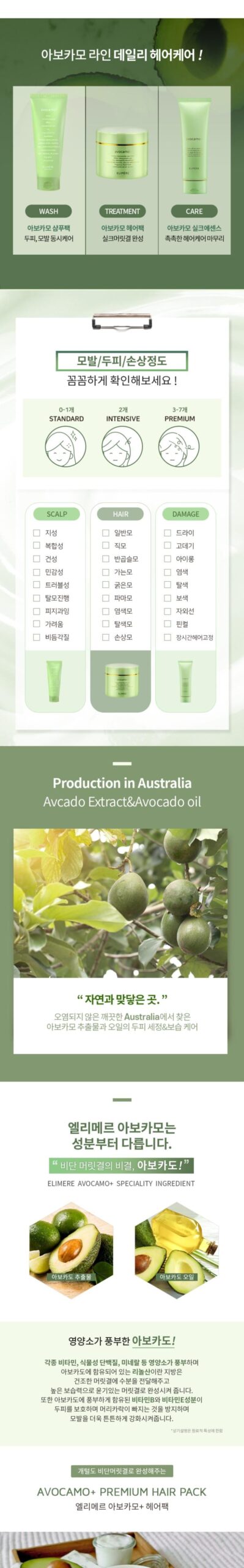 Our products are crafted in Korea, focusing on safety and efficacy. The Avocamo line includes avocado fruit extract, oils like argan and jojoba, and innovative components like amino acid complexes for comprehensive hair health.