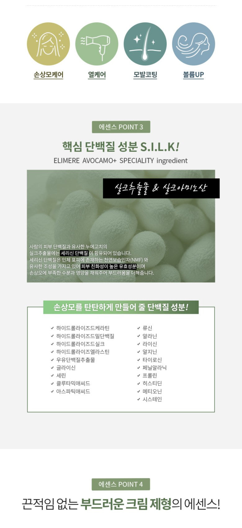 - Silk Essence: A daily no-rinse treatment that shields against heat damage and nourishes with a potent amino acid complex for smoother, silkier hair.