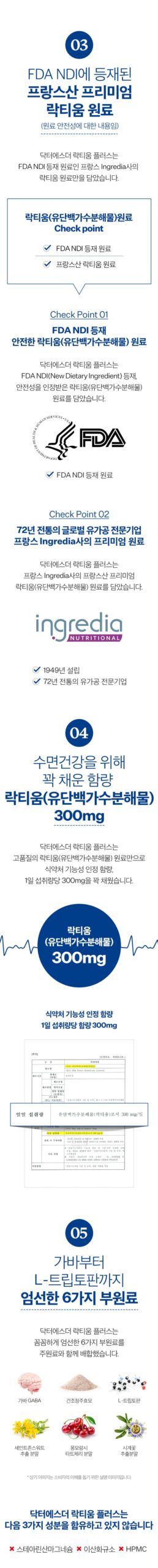 – **Lactium** (milk protein hydrolysate): 300mg per daily intake. This is the main ingredient designed to improve sleep health.